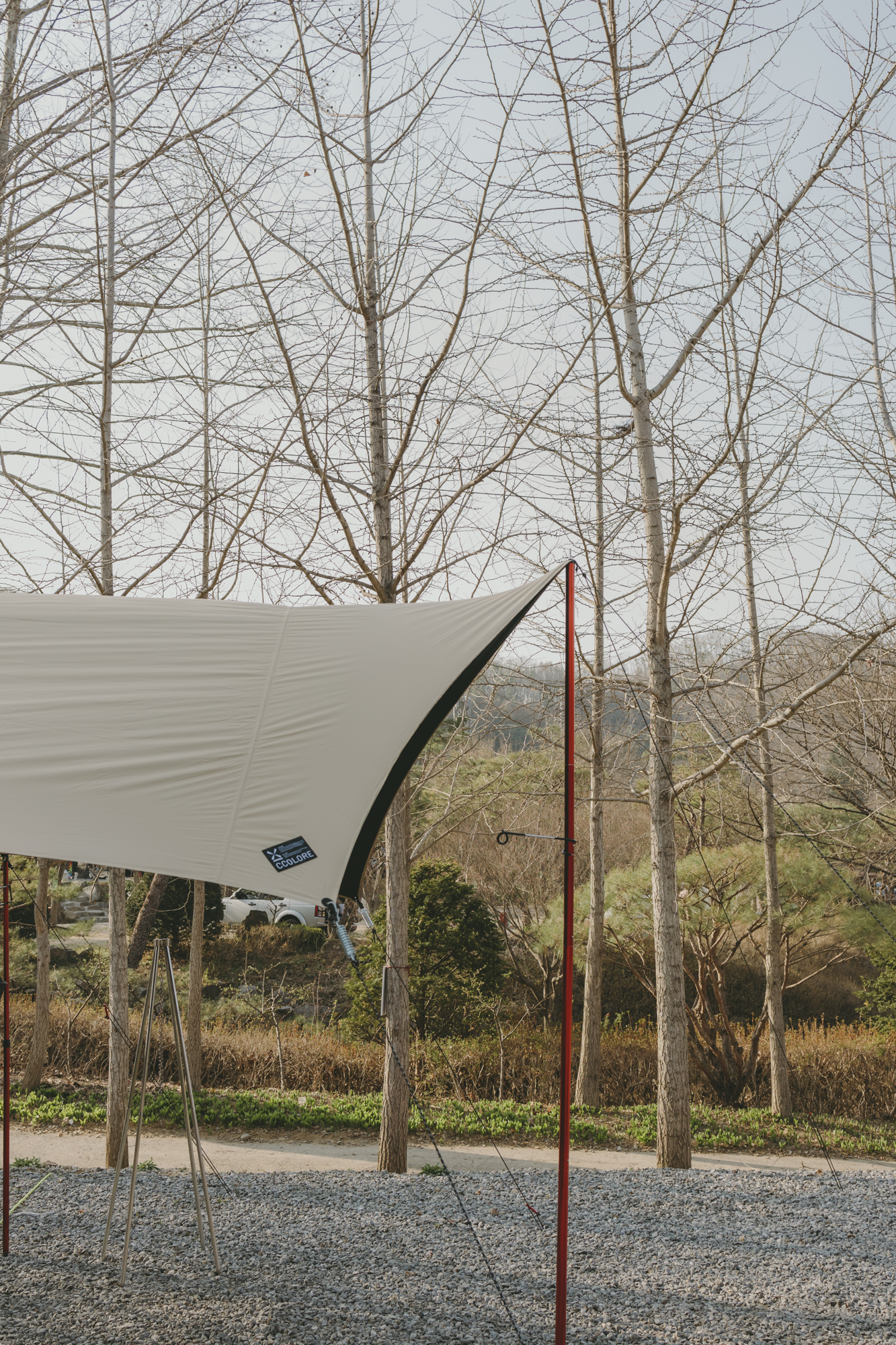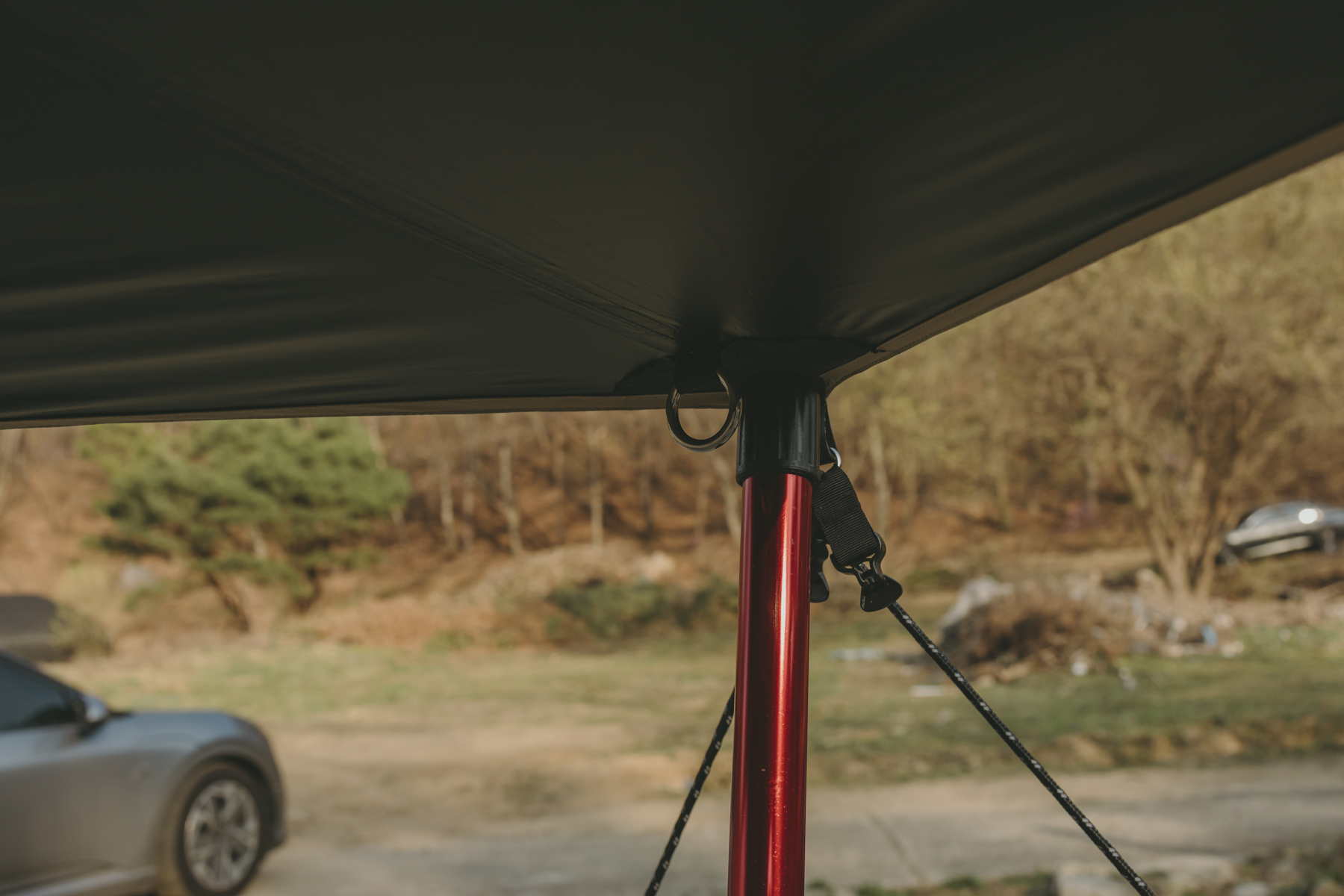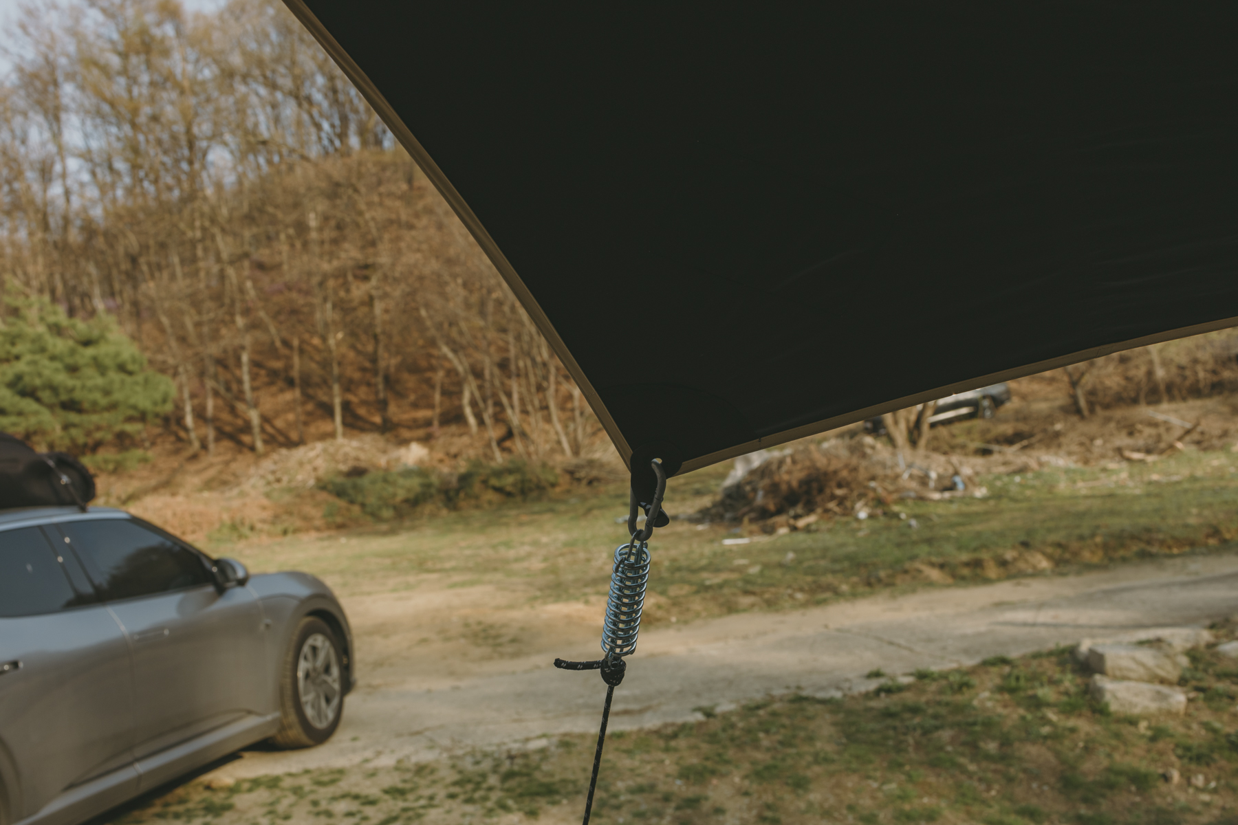 부부동반으로 가서 아이를 포함한 총 5명이서 캠핑을 즐겼는데 사이즈도 충분한 크기였어요 텐트를 타프 밖으로 설치했기 때문에 8명도 거뜬한 사이즈였습니다 나중에 부모님을 모시고 와도 좋아하실 것 같네요 그리고 위에서 언급했던 것처럼 실타프 특성상 원단이 굉장히 얇기 때문에 혹시 모를 돌풍이 무서우서 저는 타프스프링을 함께 설치해 줬어요 예전에 돌풍을 만났던 기억이 있어서 바람은 항상 조심해야겠다는 생각이 머리에 각인돼 있습니다