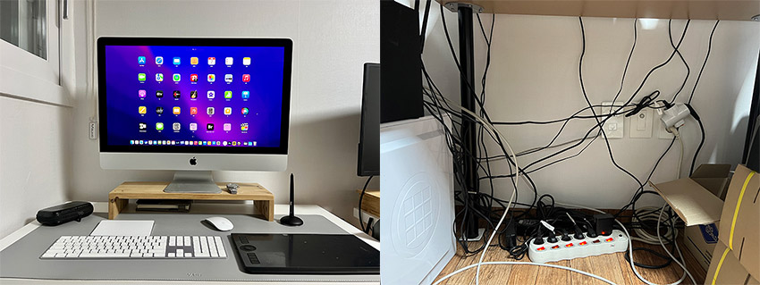 아이맥 디자인은 정말이지 모던하거나 캐주얼하거나 빈티지한 콘셉트 등등의 다양한 인테리어 환경 어디에 가져다 놓아도 정~말 예뻐요. 아이맥이 있는 것 자체 만으로도 앞에 앉아서 무언가를 하고 싶다는 생각이 들게끔 하더라고요. 일하는 환경이 재미있어지고 오래 앉아있고 싶어지다 보니까 더 좋은 결과물을 얻게 되는 것 같아요. 게다가 윈도 데스크톱을 사용할 때와는 비교도 안될 깔끔함.