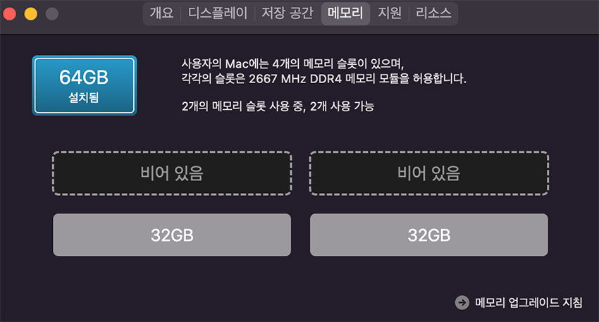 저는 구매 후 32기가 메모리 2개를 구매해서 현재는 64기가 메모리로 사용 중이에요.