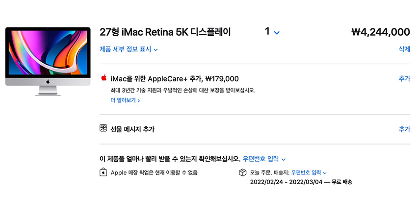 어쨌든 이렇게 구매를 해서 사용 중인데 약 반년 정도 후 지금의 M1칩이 탑재된 24인치 아이맥이 등장을 했죠. 성능을 보고 깜짝 놀라지 않을 수가 없었어요. 그런데 자세히 살펴보니 27인치 모델은 출시가 안됐더라고요.