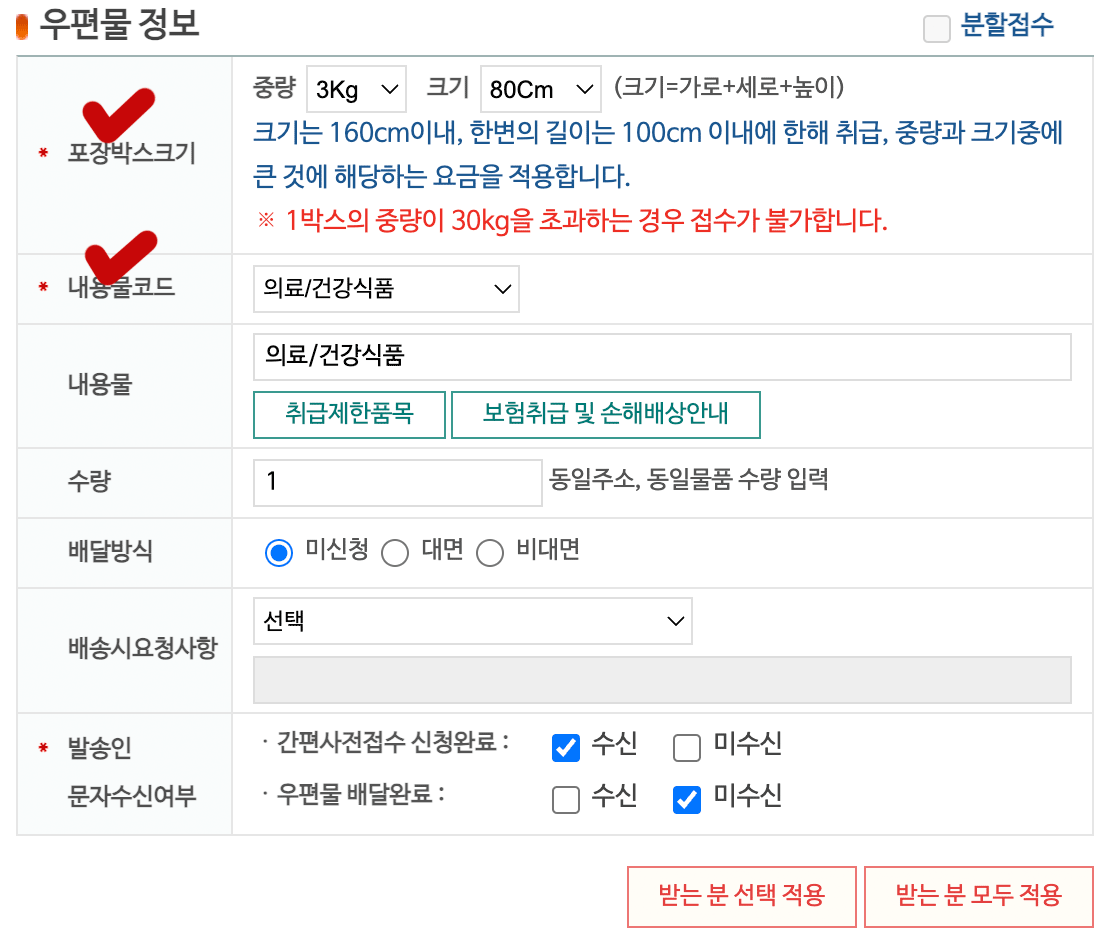 우편물 정보에서는 포장박스 크기와 내용물, 그리고 발송인 문자수신여부를 체크해주면 되며 박스크기는 대략적으로만 표시하면 되니 굳이 사이즈를 사전에 재두거나 하지 않아도 됩니다. 발송인 문자수신여부는 모두 수신으로 체크해둘 경우 카카오톡으로 배달 과정이 전부 도착하게 됩니다. 추가 비용이 발생하지 않으니 분실 우려가 없도록 모두 수신으로 체크해두는것이 좋으며 하단의 적용 버튼은 누르지 않아도 됩니다.