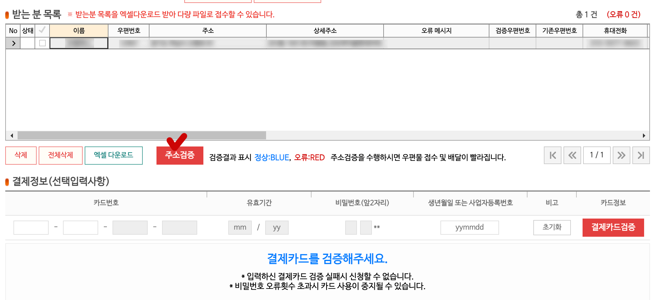 3가지 기본 항목을 모두 입력하고 나서는 받는 분 목록에서 주소검증을 눌러 잘못된 주소지가 없는지 확인을 해야합니다.
