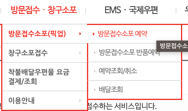 홈페이지 상단에서 방문접수.창구소포 메뉴에 마우스를 올려놓으면 서브 메뉴가 나오는데 창구소포접수 메뉴를 클릭해줍니다.