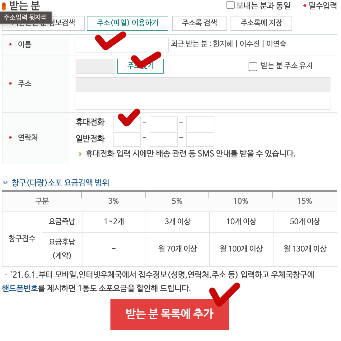 받는 분 항목 역시 이름과 주소, 연락처를 입력 후 하단에 있는 받는 분 목록에 추가 버튼을 누르면 됩니다.