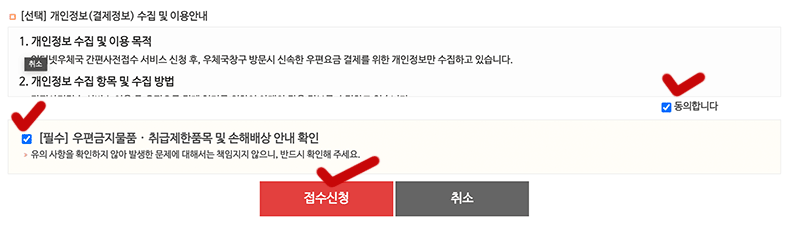 이제 마지막으로 개인정보 수집 및 이용안내에 대한 체크 항목에 체크만 해주고 접수신청 버튼을 눌러주면 사전 접수가 끝나게 됩니다.
