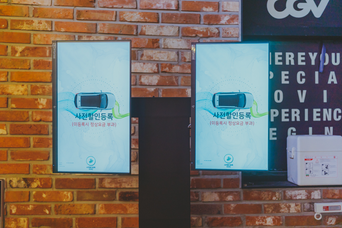 이곳 건물의 주차장은 무조건 유료 주차를 해야 합니다.(영화만 볼 경우.) 4층의 엘리베이터 앞에 보면 아래 사진처럼 키오스크가 있는데요 바코드나 영화 예매권을 인식하는 내용은 전혀 없고 차량 번호만 입력을 하면 할인이 적용됩니다.