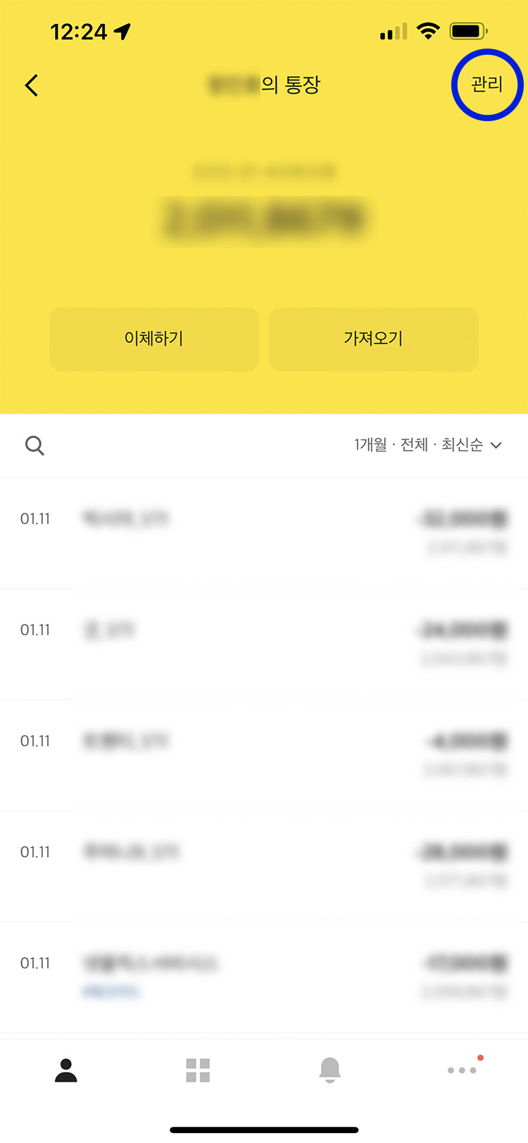 통장 잔고와 이체 내역이 쭉~ 나오는데 우측 상단의 '관리'버튼을 클릭해 주세요!