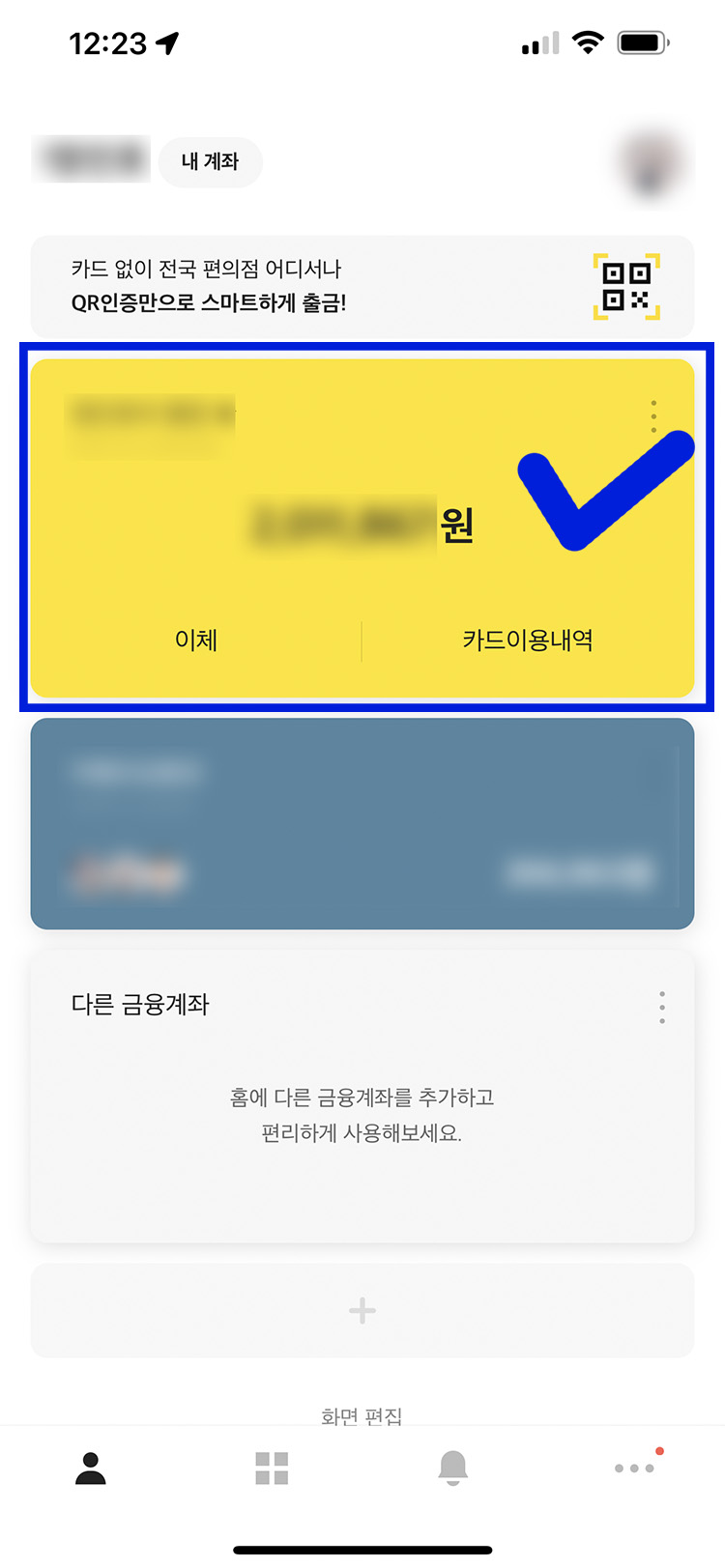 우선 카카오 뱅크 앱을 실행 후 다운로드하고 싶은 통장 계좌를 터치해 주세요