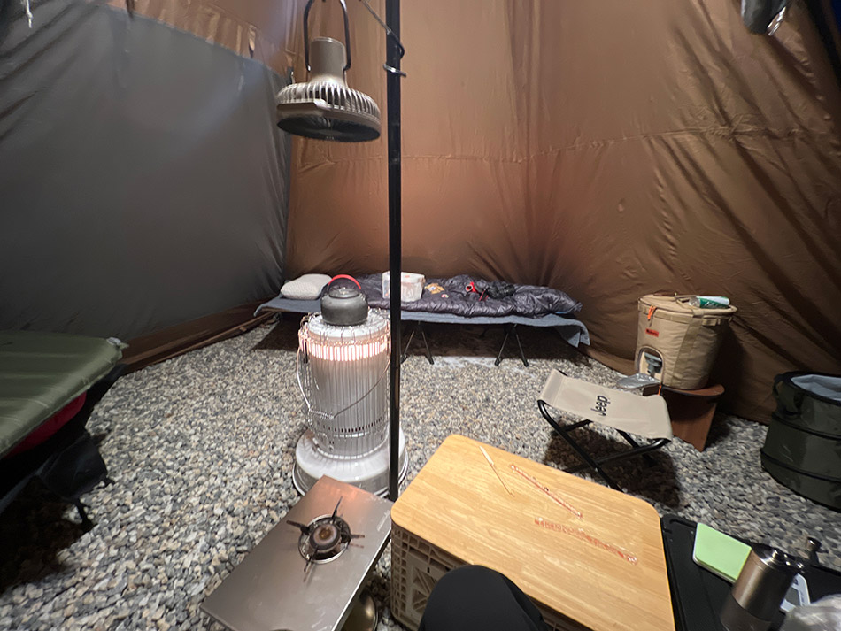 해가지고 기온이 영하 5도로 기온이 뚝 떨어진 캠핑장에서도 텐트 내부는 충분히 따뜻해져서 패딩 점퍼를 입고 있지 않아도 좋을 온도까지 올라갔었는데요