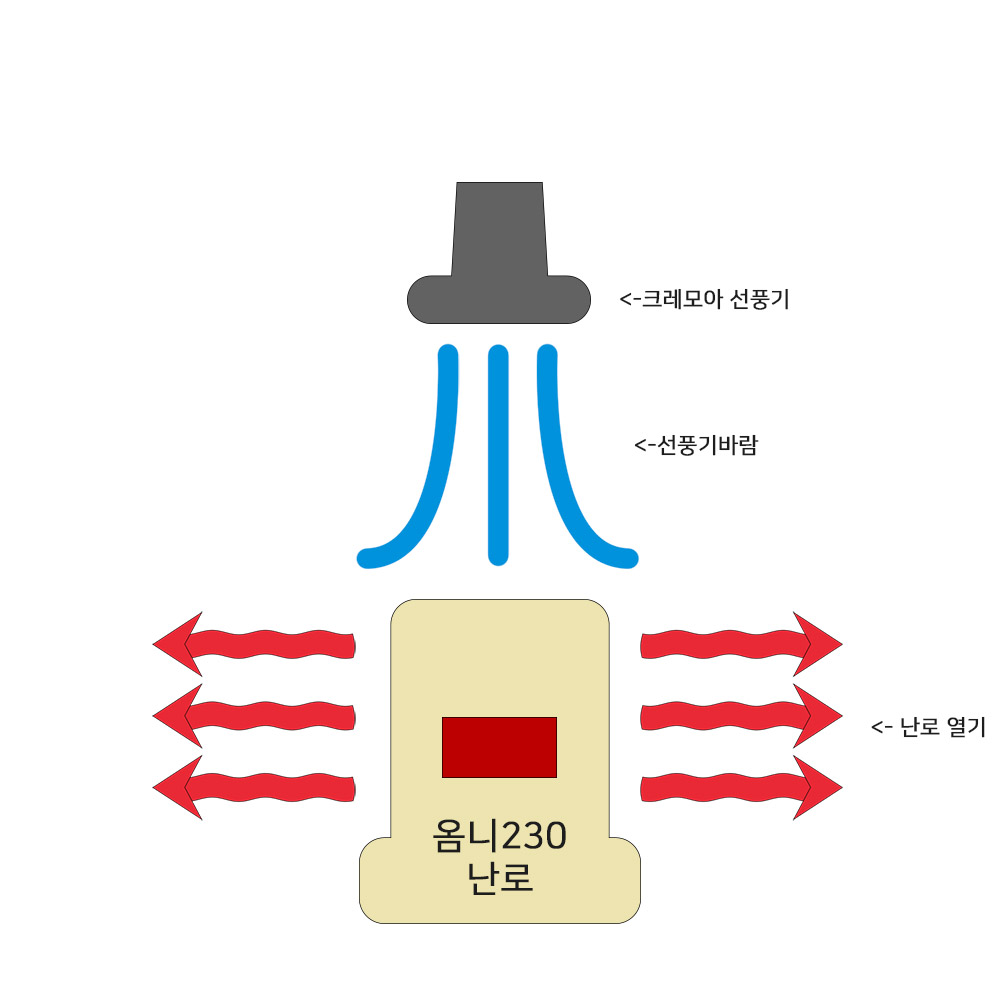 저는 난로 위 약 40~50cm 위에서 크레모아 선풍기를 난로 정 중앙으로 바람이 내려가게 위치를 잡아주었는데요. 이렇게 선풍기 위치를 잡으면 선풍기가 너무 뜨거워지는 거 아니냐, 또는 난로 내부에 바람이 흔들려 그을음 연기가 발생하는 것 아니냐 하는 걱정이 있을 수 있습니다.