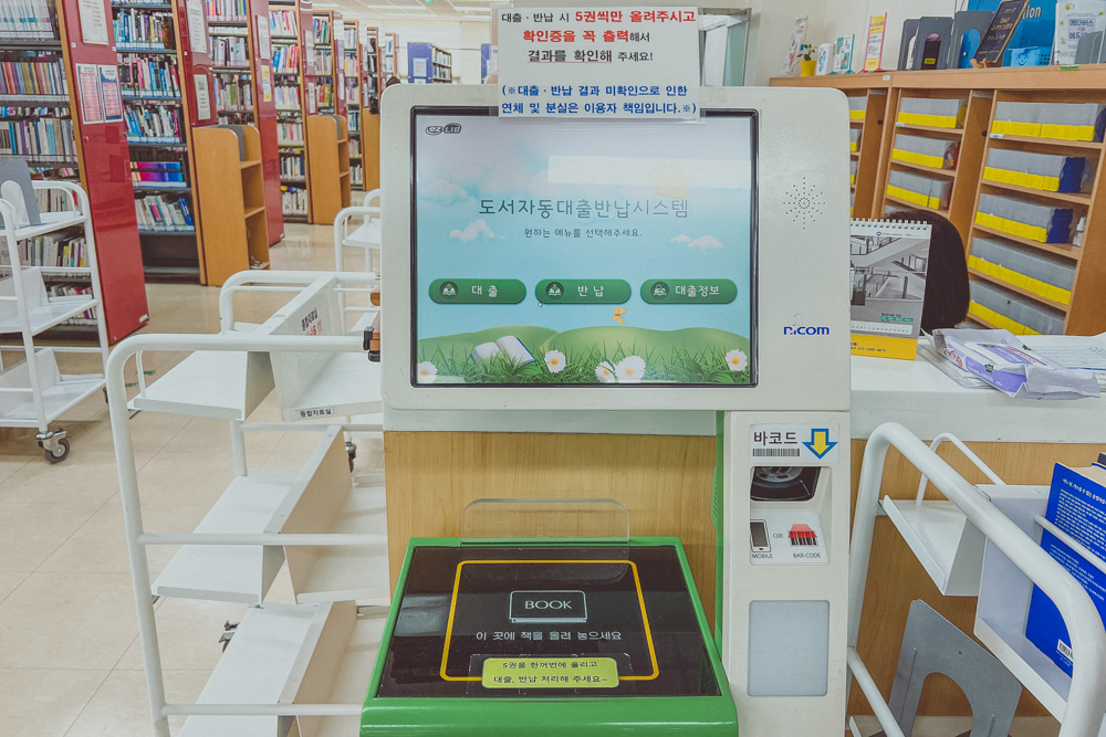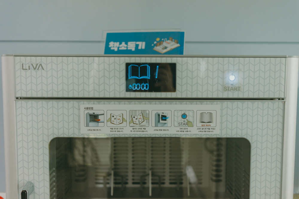 3층 엘리베이터에서 내리면 바로 앞에 책 소독기가 설치되어 있는 걸 볼 수 있는데 오늘은 소독 중인 책이 없었어요 예전에 돌아가는걸 한번 본 적이 있었는데 저 기계 안에 책을 넣어두면 책이 한 장 한 장 자동으로 넘어가면서 살균을 하고 있는 모습을 볼 수 있어요. 코로나로 많은 사람들이 손이 오가는 장소인 만큼 청결하게 관리되고 있는 것 같아 안심할 수 있는 것 같습니다.