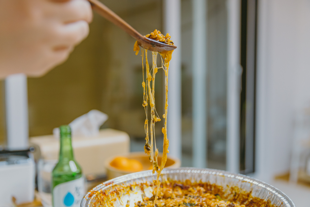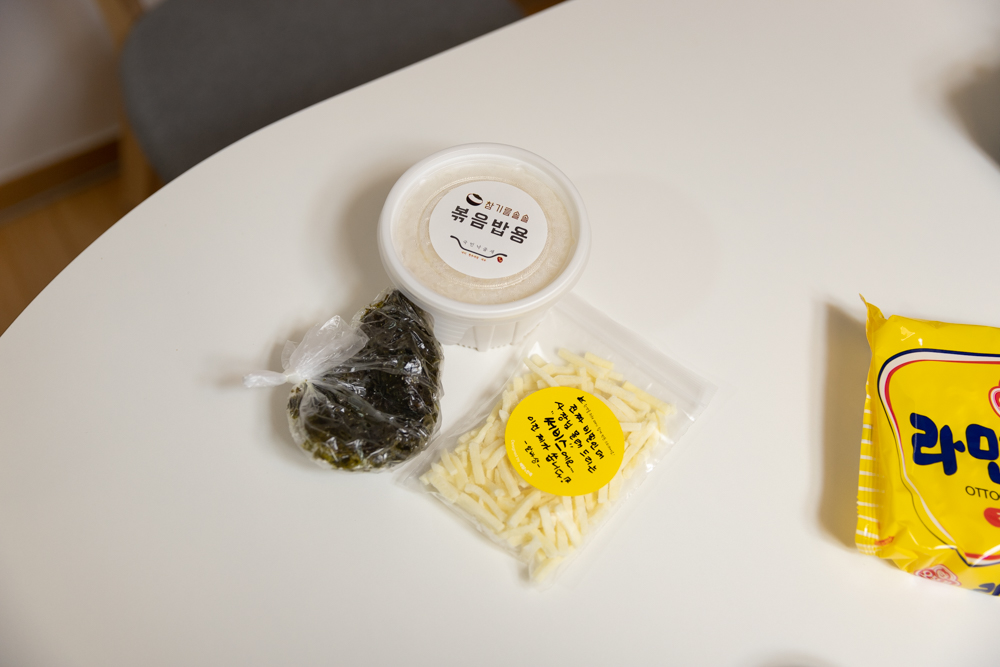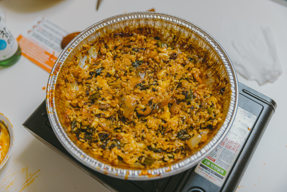 낙곱새를 다 먹고 나면 용기에 그대로 볶아 먹을 수 있는 밥과 김, 치즈 서비스.