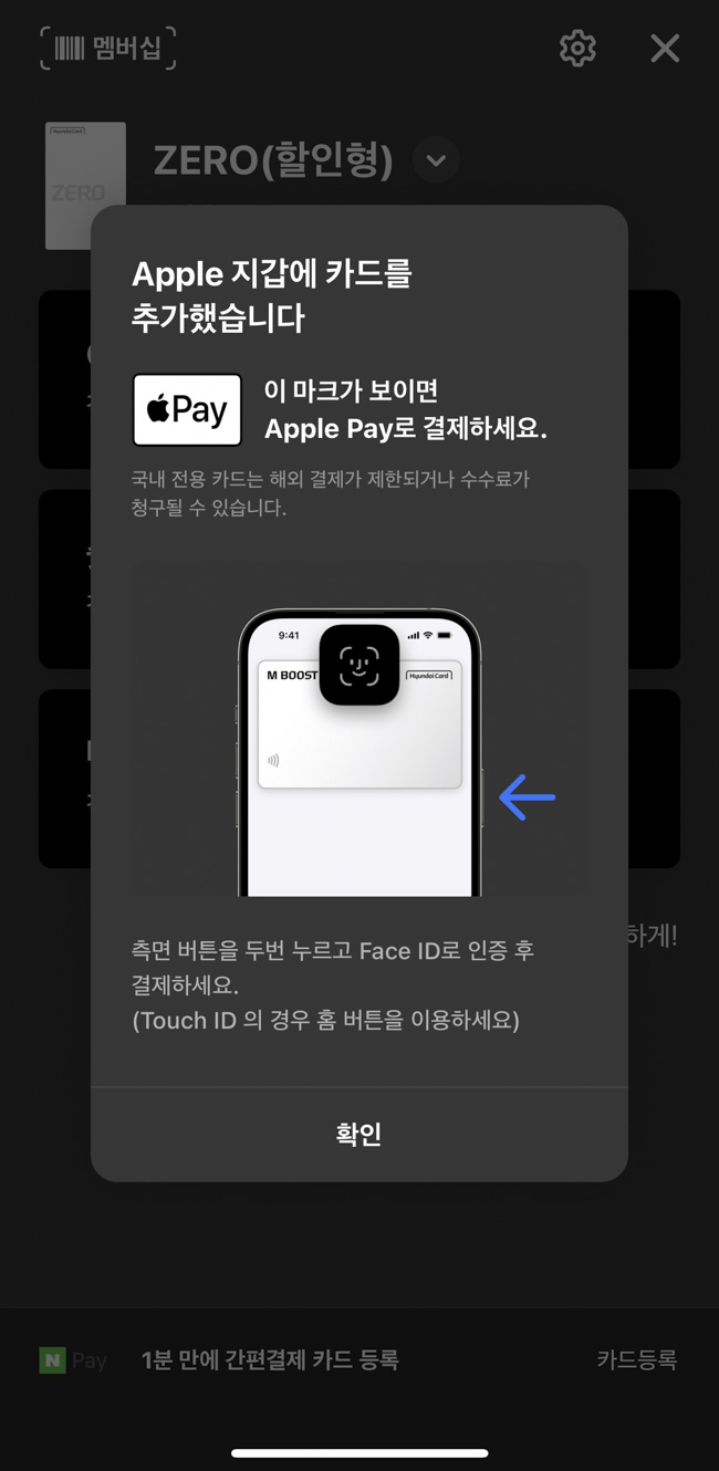 20. 이제야 애플 지갑에 카드를 추가했다는 팝업창이 뜨네요 "확인"버튼을 눌러줍니다.
