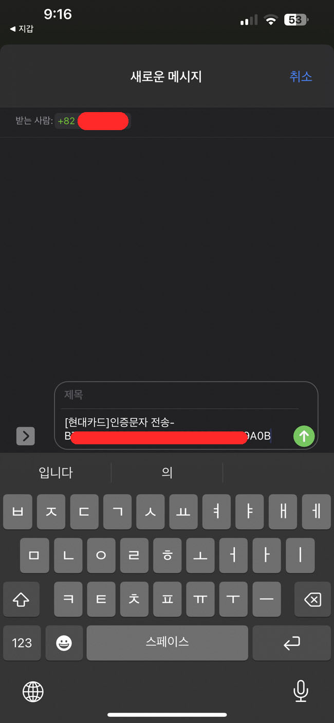 8. 자동으로 메세지 앱으로 화면이 전환 되는데 보내야 하는 인증 내용은 이미 적혀있으니 전송 버튼만 눌러줍니다.