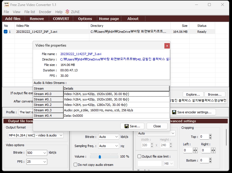 예를 들어서 전방카메라+오디오를 추출하고자 한다면 위의 팝업창에서 확인한 것처럼