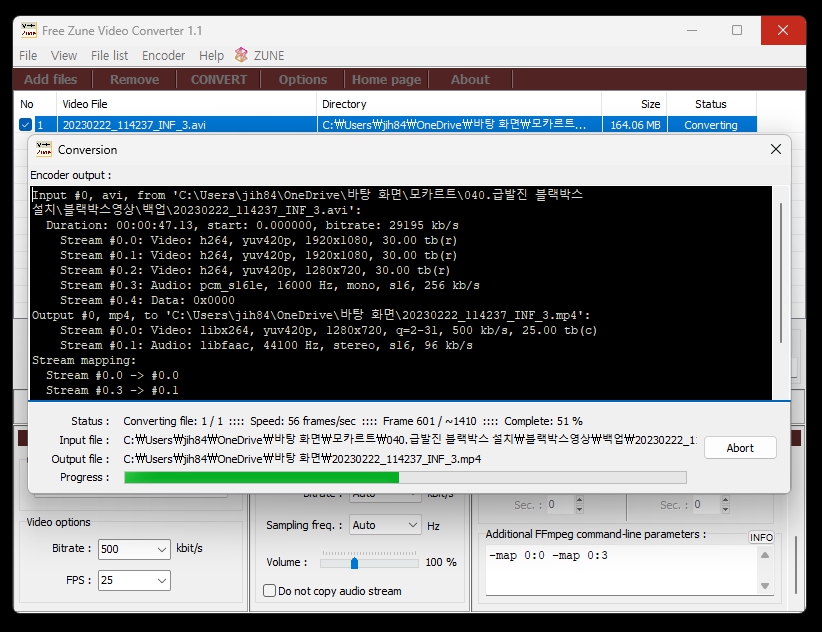 그다음 Add files 버튼 오른쪽 2번째에 convert 버튼을 누르게 되면 아래와 같이 프로그램이 돌아가면서 지정해 준 폴더로 추출된 채널의 영상이 저장됩니다.