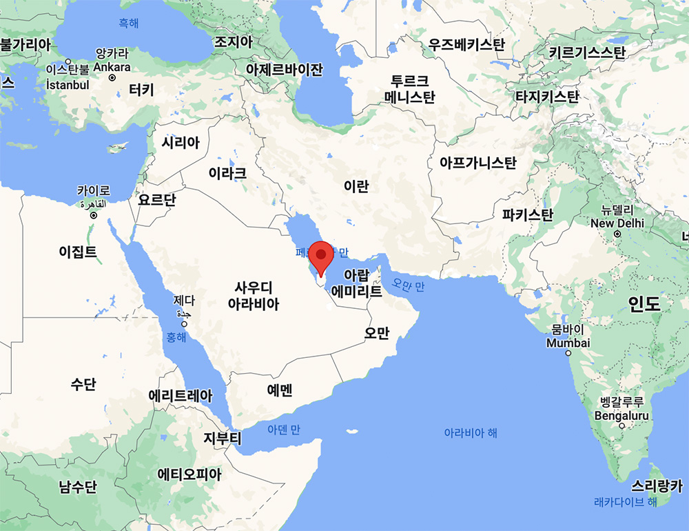 카타르는 지도상에서 보면 사우디아라비아와 아랍에미리트 사이에 있습니다.