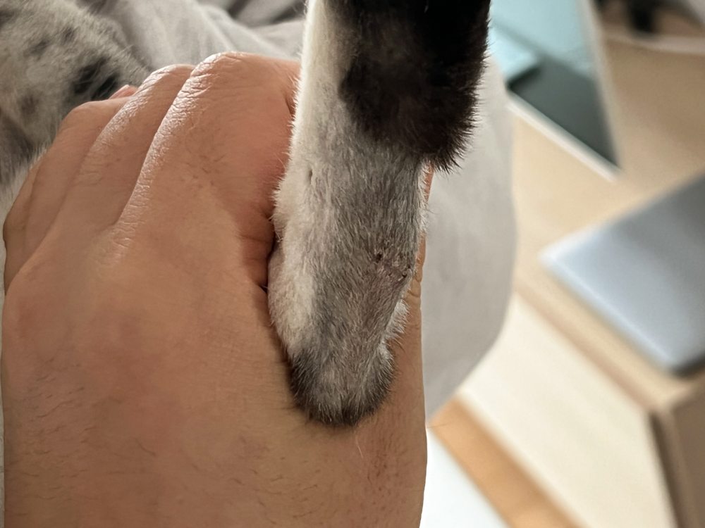 실밥이 조금 보이고 있는 와중에 상처 난 부위의 털이 그새 자라나고 있었어요